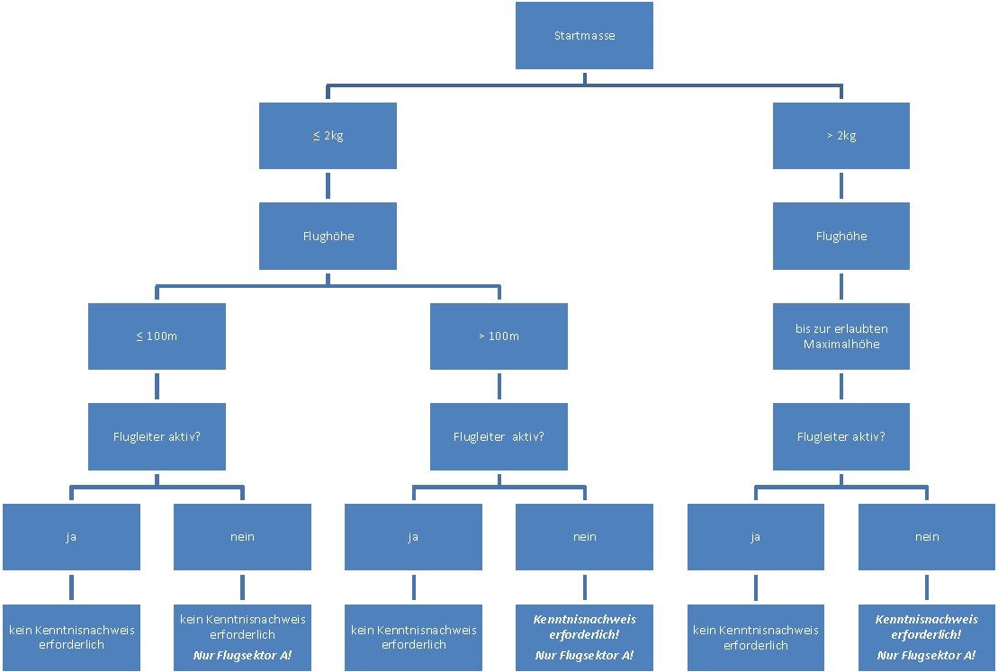 Ob je nach Startmasse, Flughöhe und Anwesenheit eines Flugleiters ein Kenntnisnachweis erforderlich ist, beantwortet das Flussdiagramm in der Anlage (gilt ab dem 01.10 .2017)